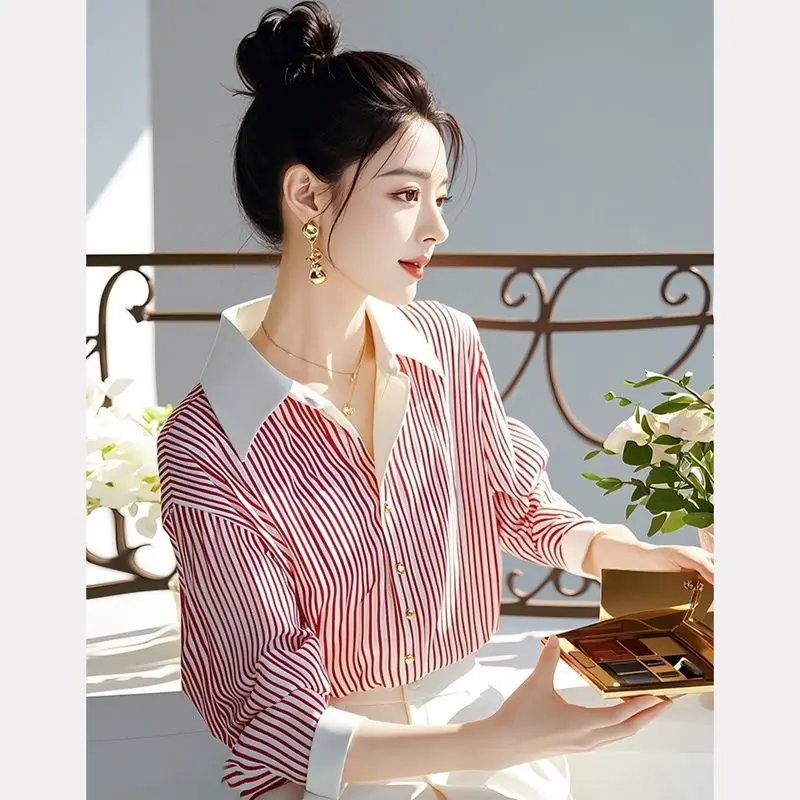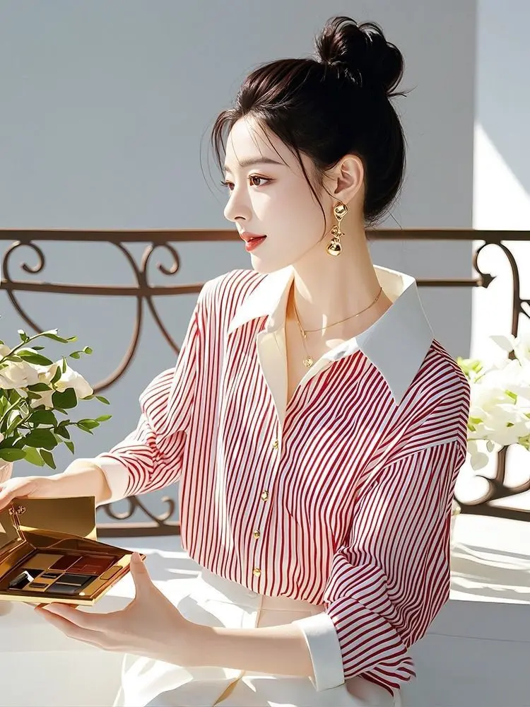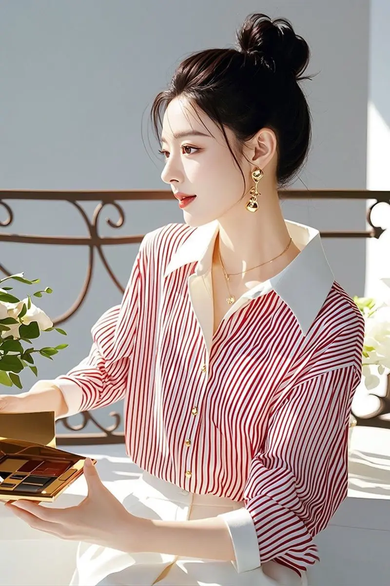 青春ムードあふれる赤ボーダーのポロ襟ブラウス♡
