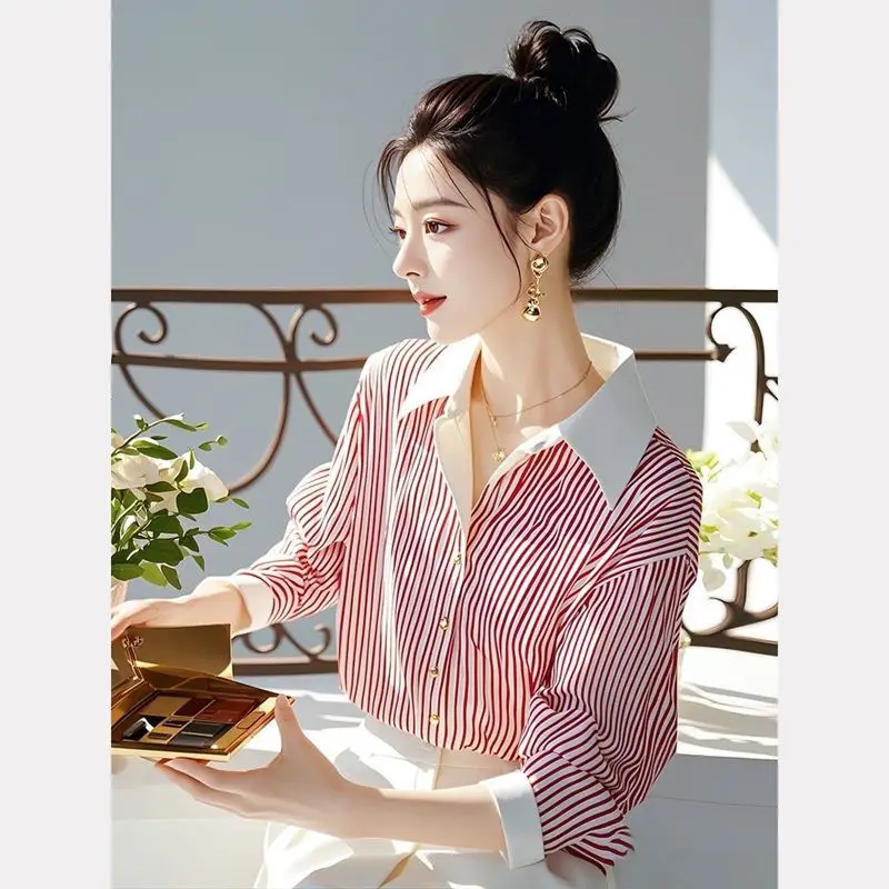 赤ボーダー長袖ポロブラウス│春秋ゆるシルエット