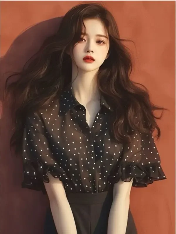 黒地ドットフリル シフォンショートスリーブブラウス│ハイエンドエレガント