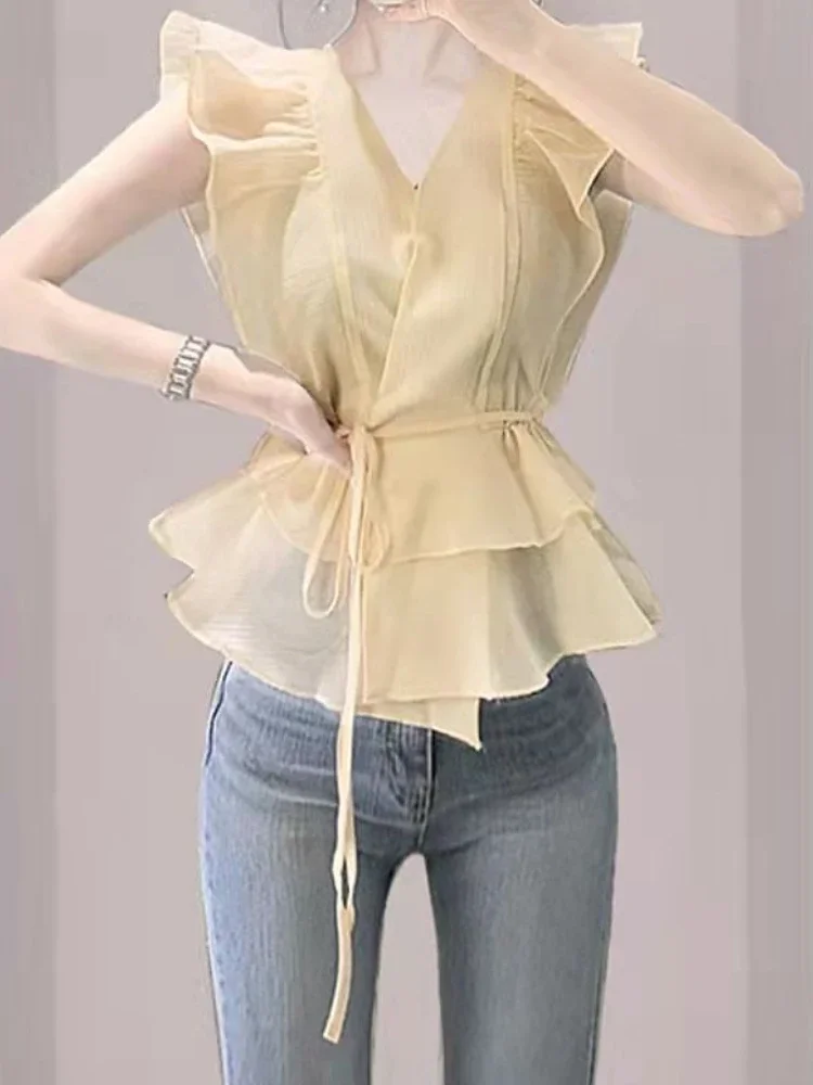 韓国風Vネックフリルスリムブラウス│レトロ可愛い大人シルエット