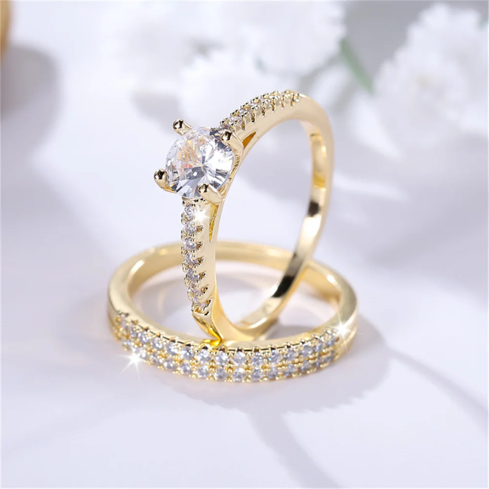 純白ジルコニアが手元で優雅にきらめく、2本セットのリング。華奢なフォルムと肌なじみの良いゴールドカラーで、日常のエレガンスから特別な約束のシーンまで幅広く活躍します。