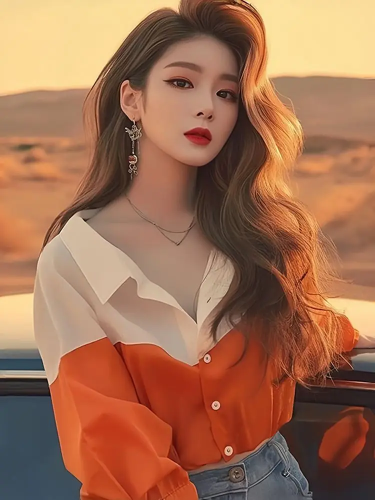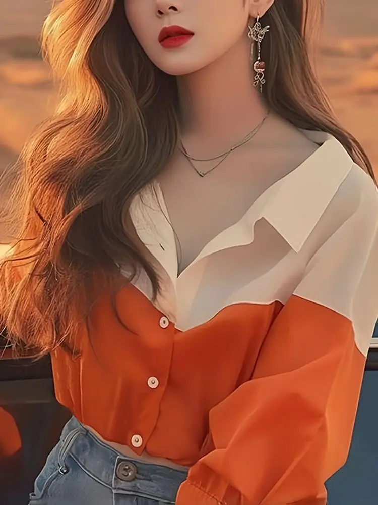 コントラストパッチワーク ポロネック長袖シャツ│ハイストリートルーズシルエット