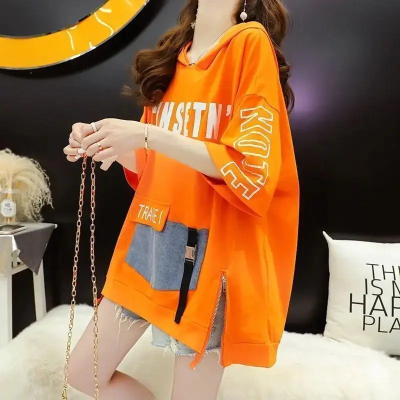 韓国風Y2Kハラジュクフード付き肩開きVネックTシャツ│レタープリント